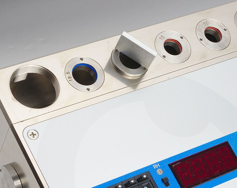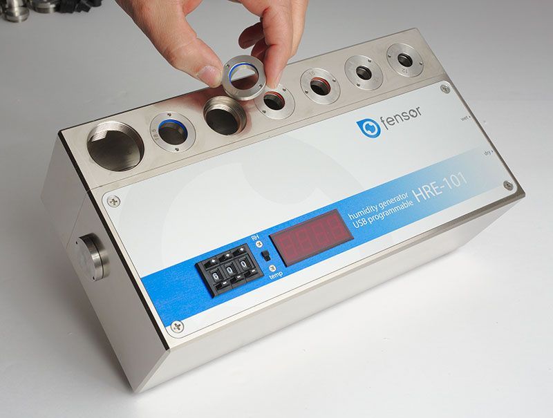 Der HG101 wurde deshalb für den Betrieb mit dem Taupunktspiegel MBW 473-RP2 konzipiert. Der RP2-Taupunktmesskopf passt direkt in die 30 mm Fühleröffnungen, zudem kann der externe Pt-100 Temperaturfühler mit einem speziellen Adapter an jeder Fühleröffnung positioniert werden.
